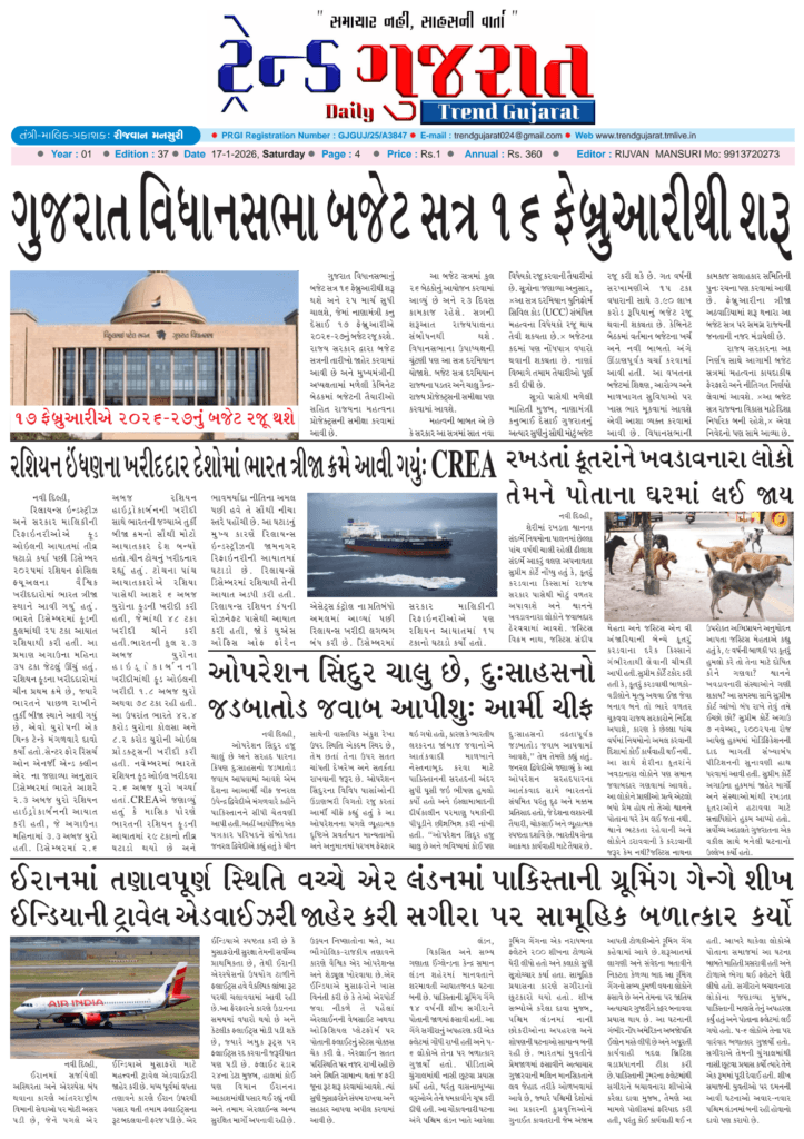 Read today’s Trend Gujarat E-Paper dated 17 January 2026. Get latest Gujarati news, politics, business, sports and local updates in one place. Download and read online.